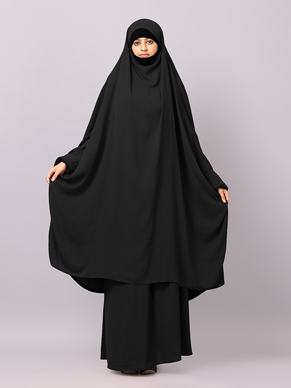 Schwarzer Jilabab wirkt edel, ist gleichzeitig luftig und bequem. Der Rockteil ergänzt die Robe stilvoll – ideal für Gebet oder festliche Gelegenheiten