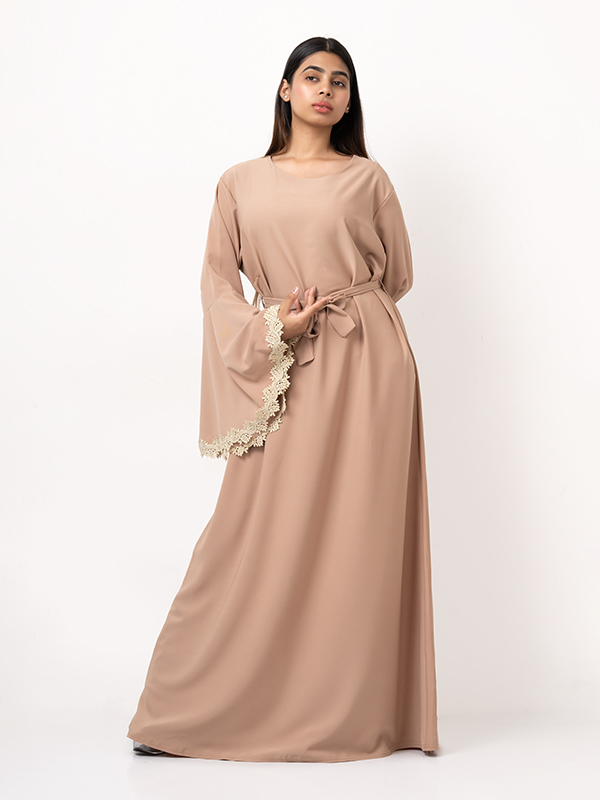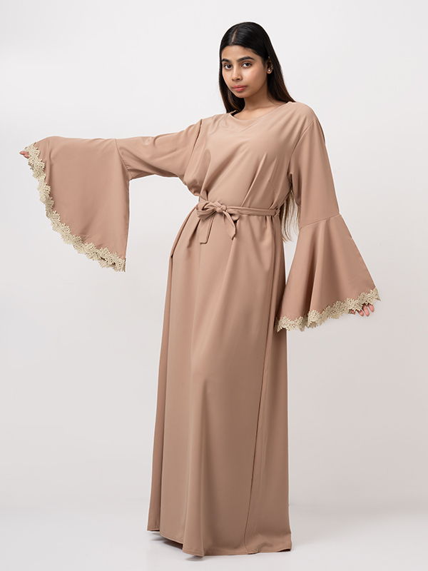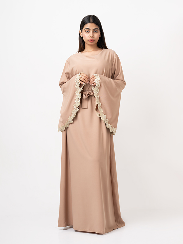 Dieses Kleid ist eine elegante und schlichte Abaya in einem warmen, neutralen Beigeton, ideal für Anlässe und den täglichen Gebrauch. Es besteht aus Viskose, einem leichten, pflegeleichten Material, das bei 30 Grad waschbar ist und einen komfortablen Tragekomfort bietet.