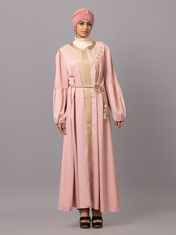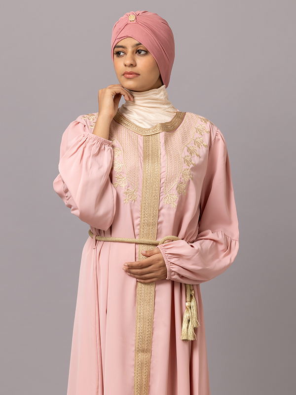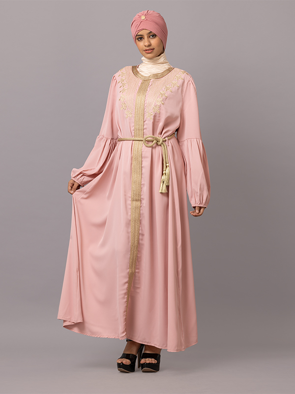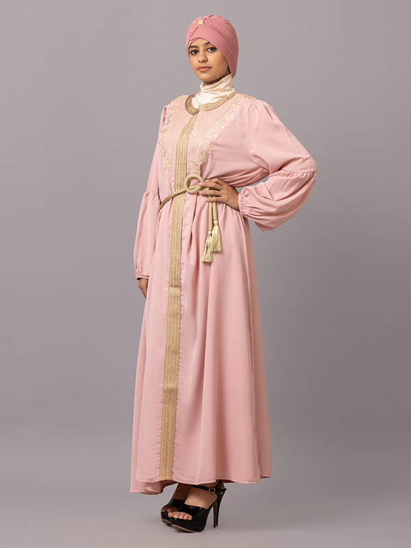 Dieses Kleid ist eine stilvolle und festliche Abaya, die sich perfekt für besondere Anlässe eignet. Der sanfte Rosaton verleiht dem Kleid eine feminine und edle Ausstrahlung, während das hochwertige Viskosematerial für Komfort und Atmungsaktivität sorgt. Die Viskosefaser macht das Kleid weich und fließend und bringt eine leichte Bewegung in den Stoff, wodurch es sehr elegant fällt.
